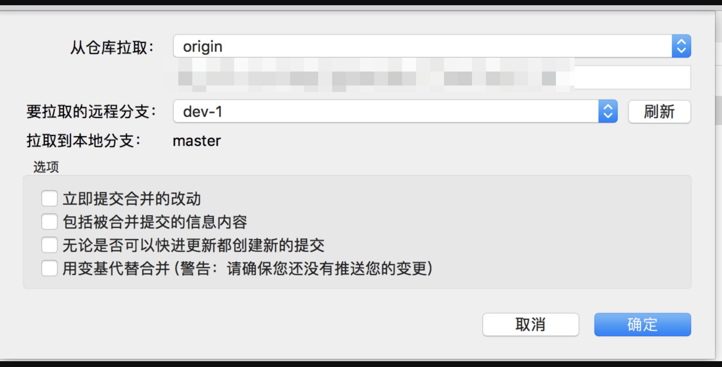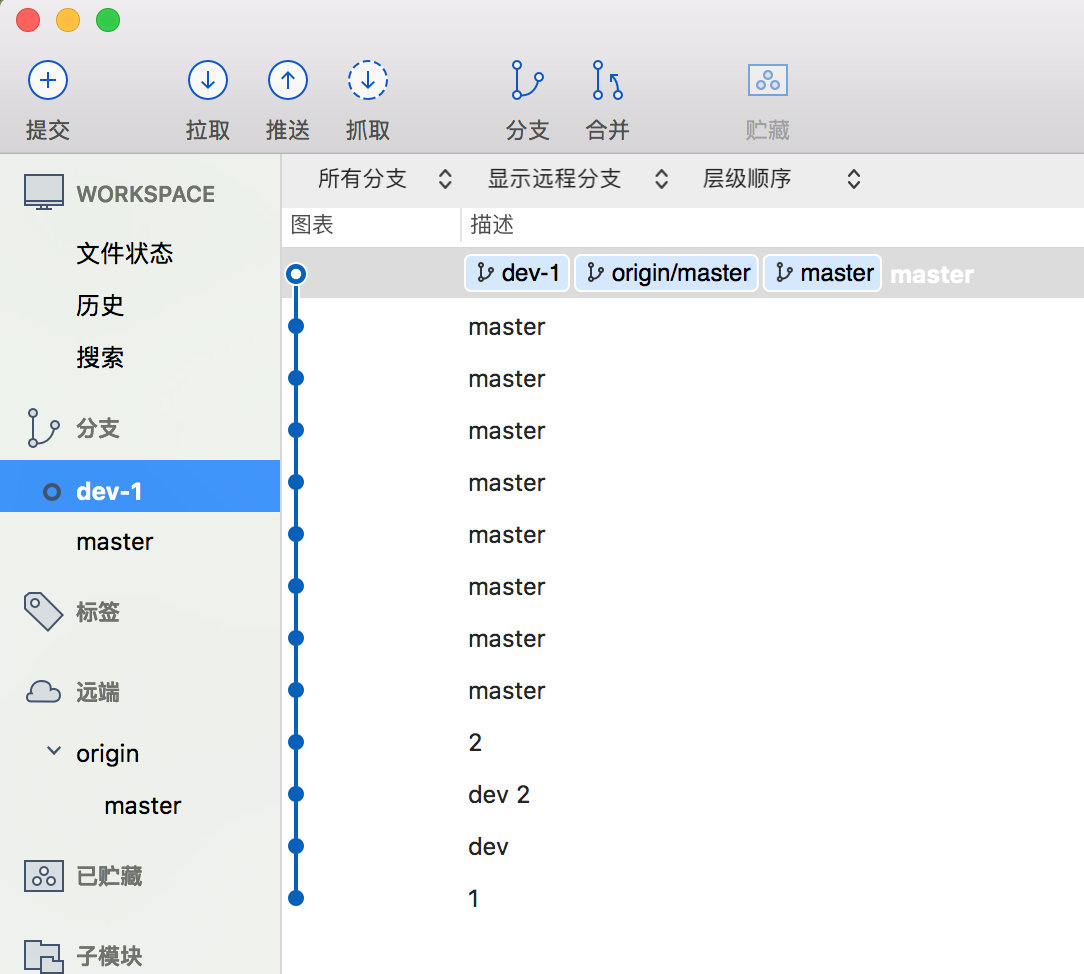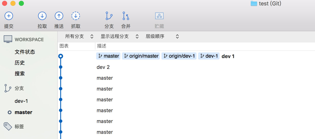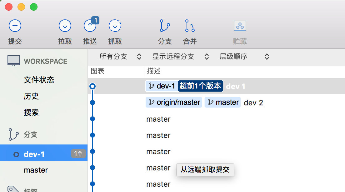 最后’推送’我们的开发分支 dev-1 到远端,切换到 master 分支,点击 拉取,拉取 dev-1 的更新到 master 分支