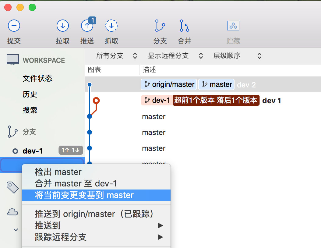 切换到自己的开发分支 dev-1,选中 master 分支,右键,选择 将当前变更变基到 master