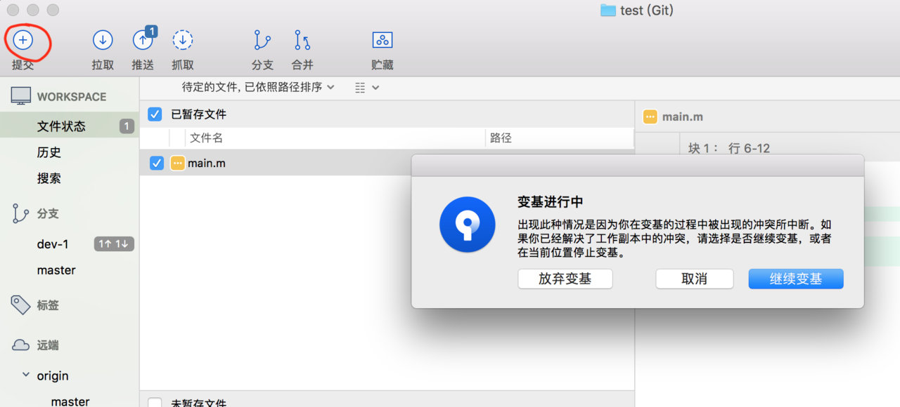 如果有冲突则合并冲突,点击左上角的加号,选择 继续变基